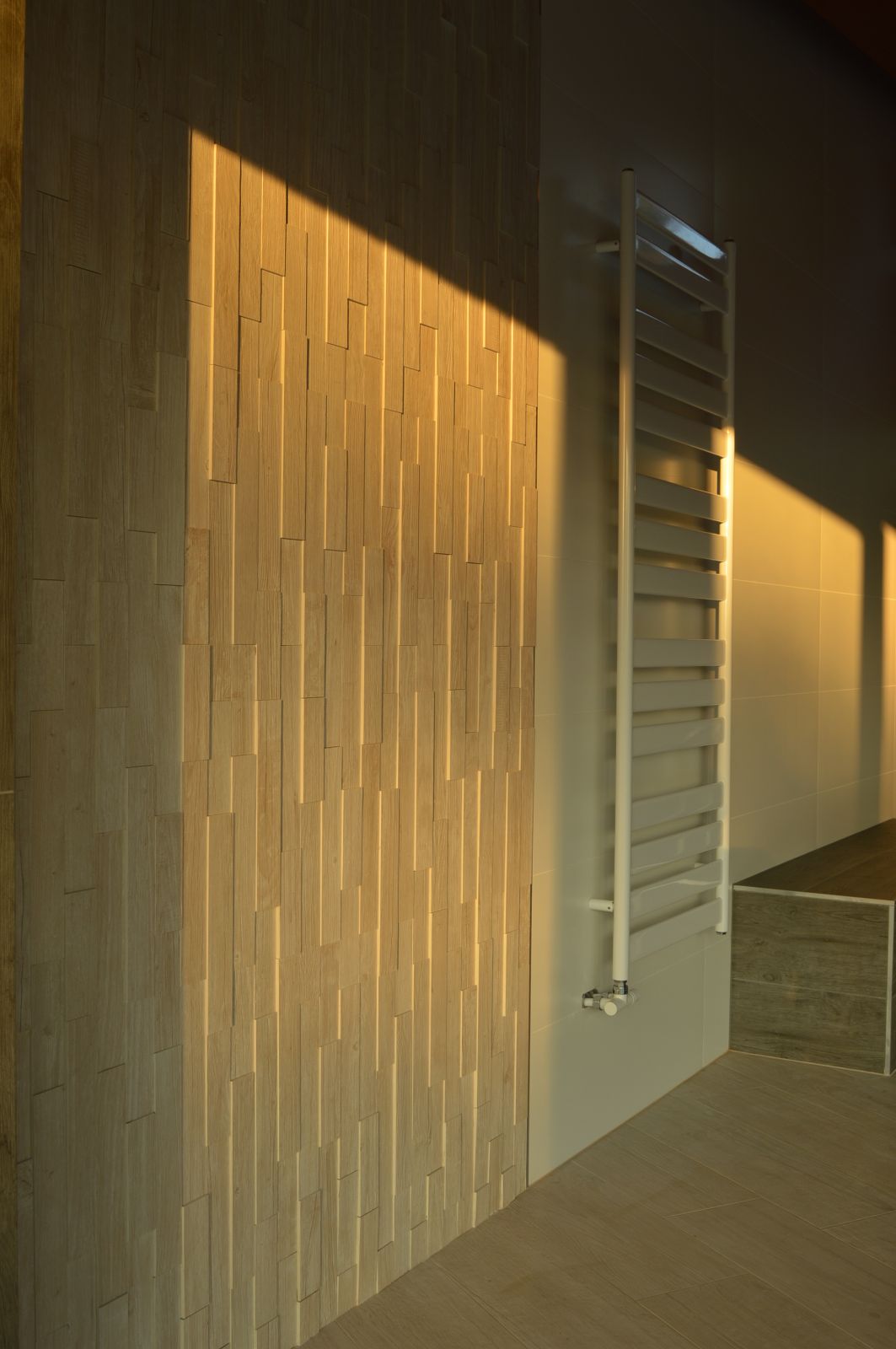 Obklady a dlažby vo farbách : biela, svetlá smotanová a sivá jemne dopĺňajú drevené prvky t.j. strop, konštrukcie dvier a okien. Navrhnuté dlažby a časti obkladov sú v drevodizajne, aby interiér pôsobil teplo a prívetivo. V kombinácii s matnou bielou na väčšej časti obkladov a jasne bielou omietkou pôsobí interiér svetlo, nadčasovo a luxusne.