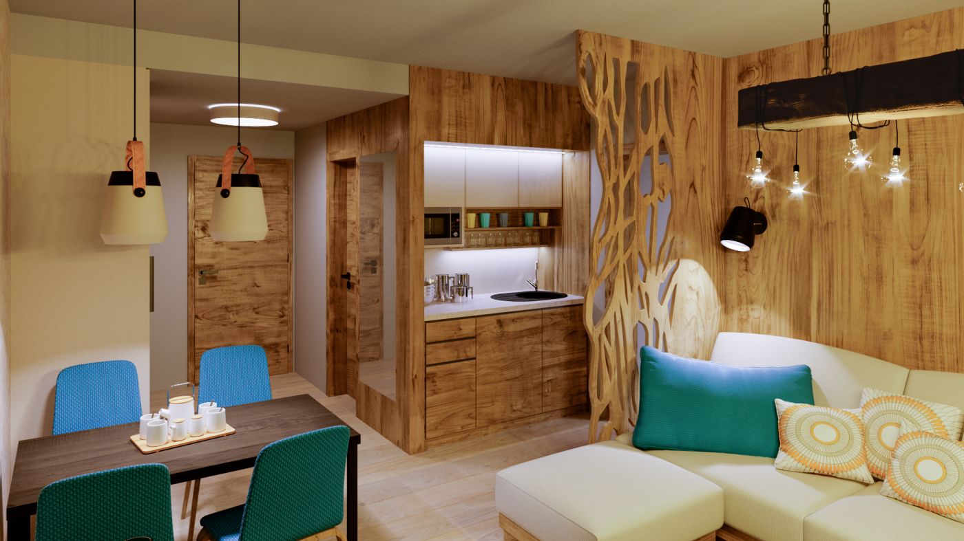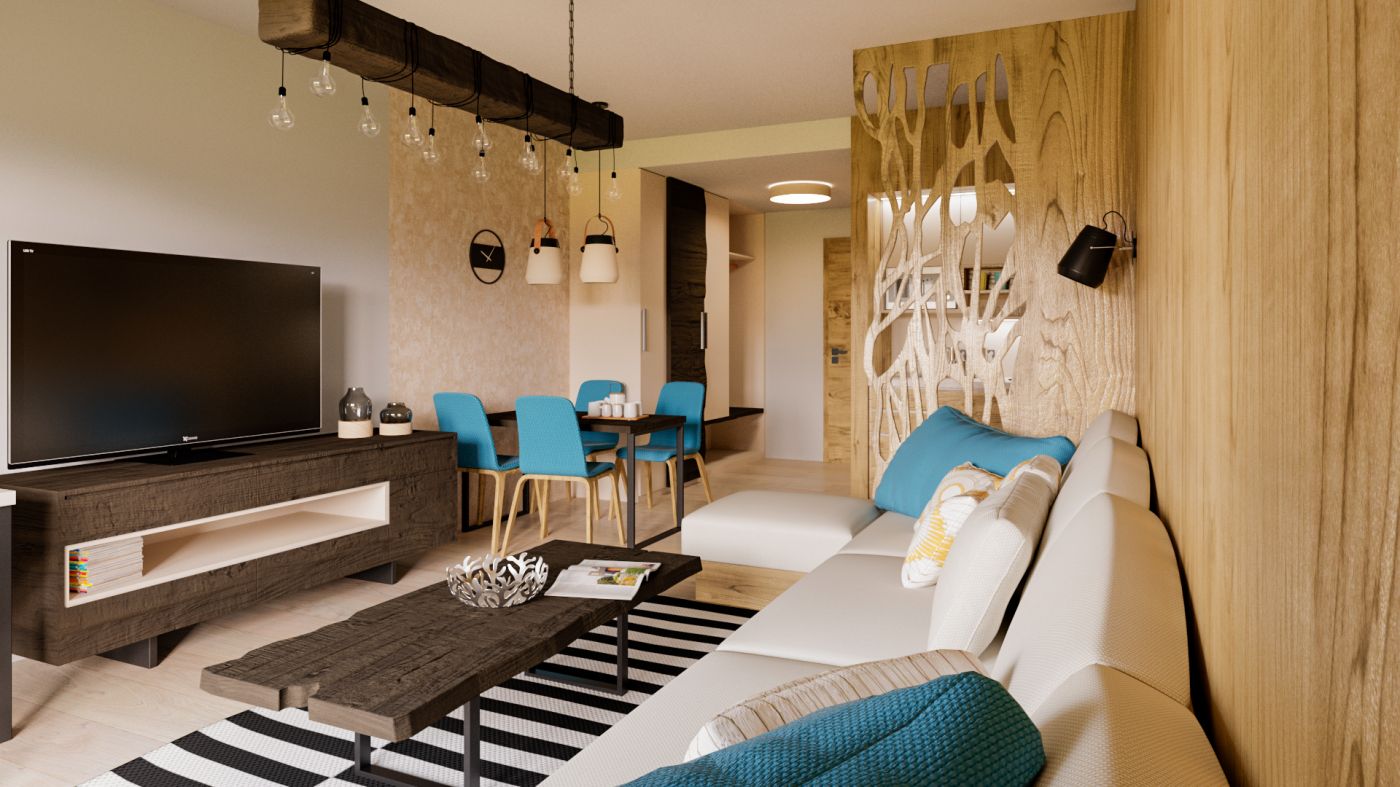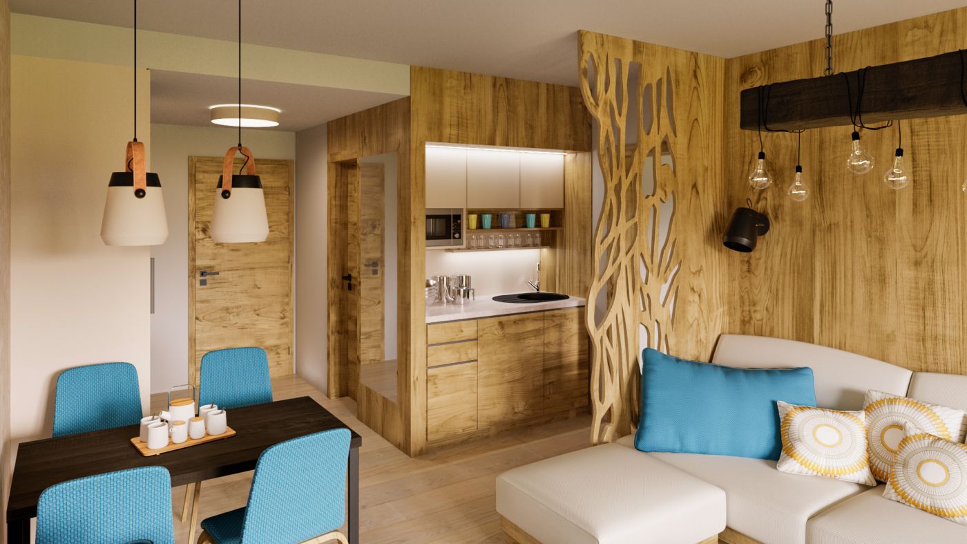 Interiér apartmánu v horskom prostredí v sebe spája tradičný materiál - drevo so strohou jednoduchosťou navrhnutého nábytku.