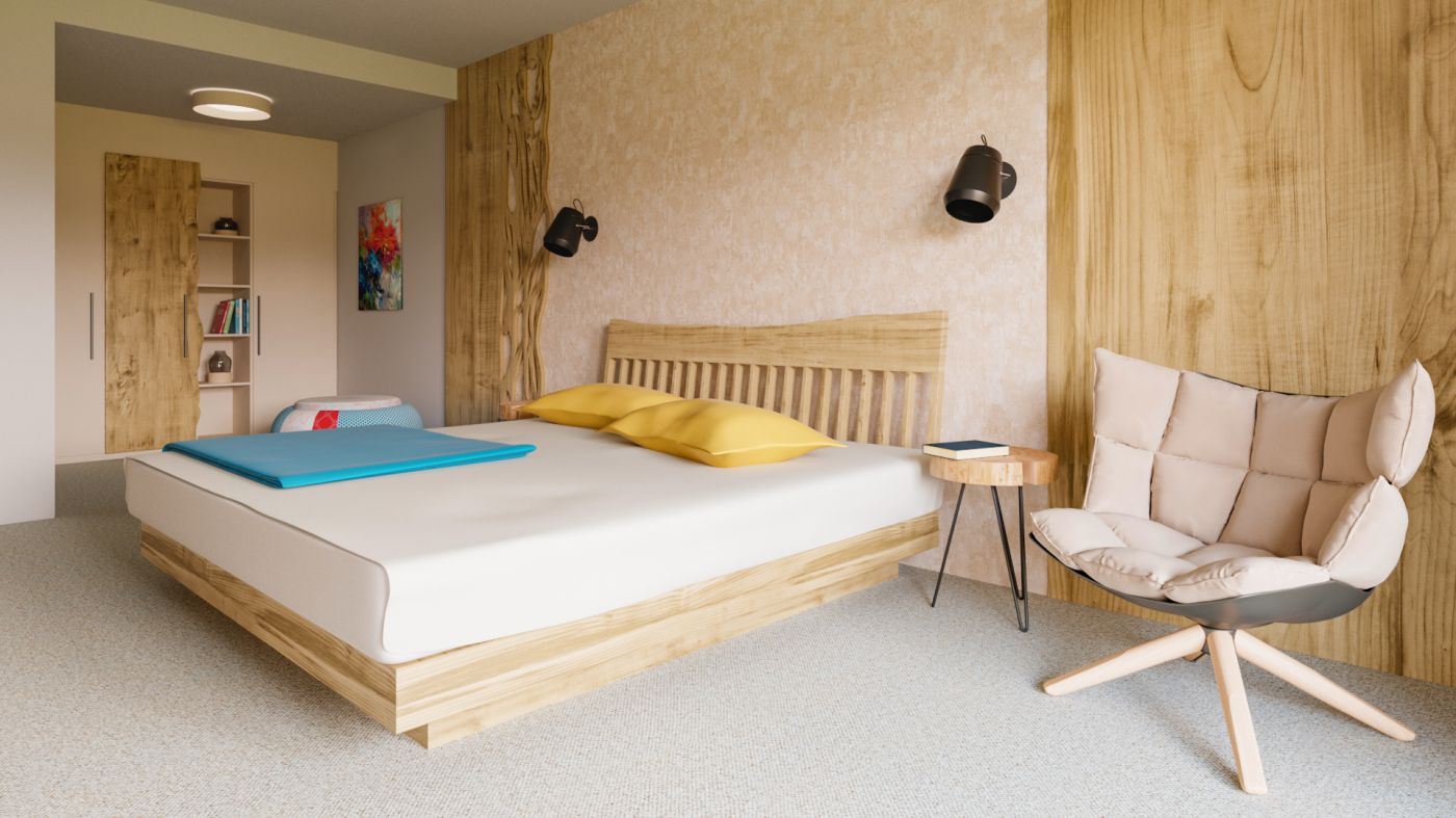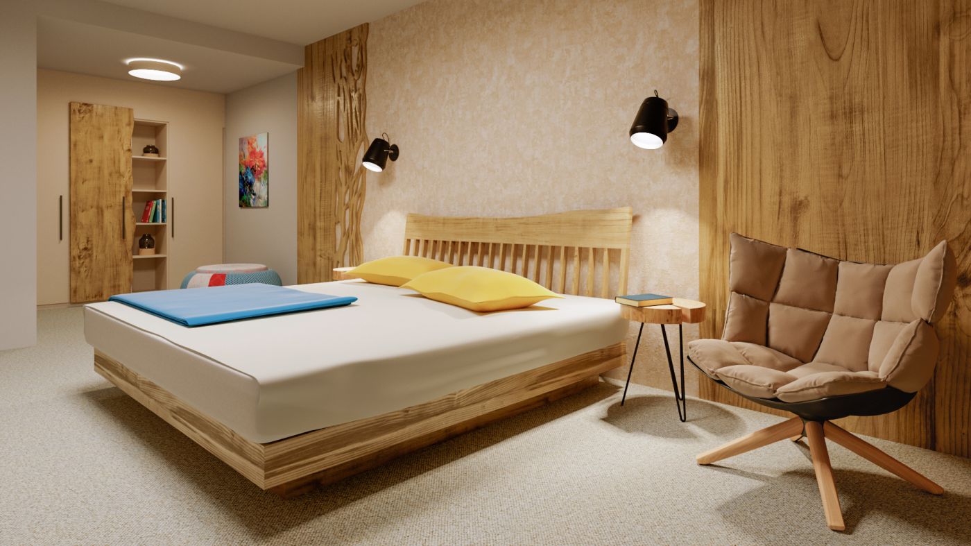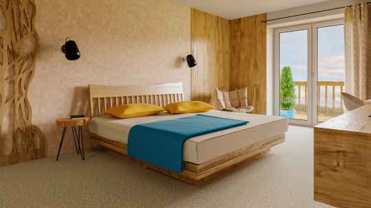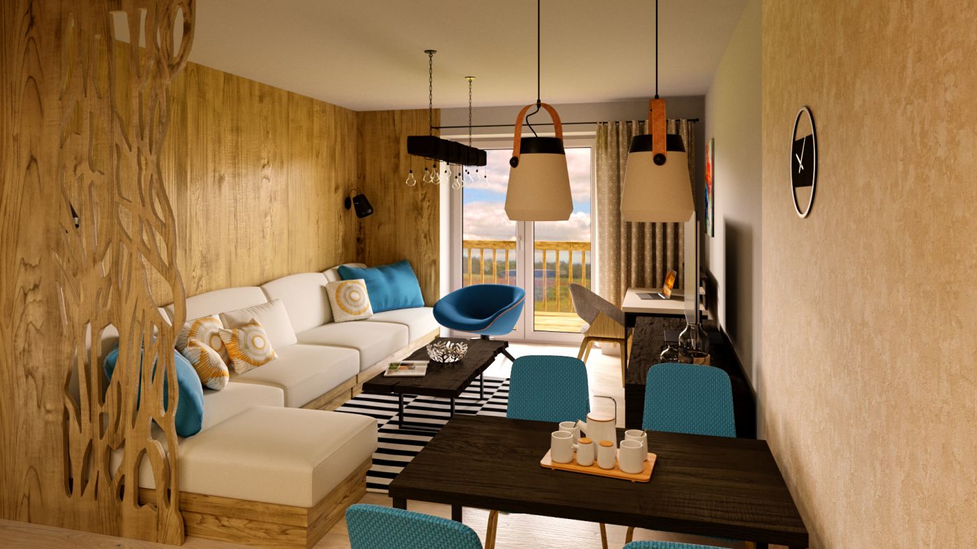 Interiér apartmánu v horskom prostredí v sebe spája tradičný materiál - drevo so strohou jednoduchosťou navrhnutého nábytku.