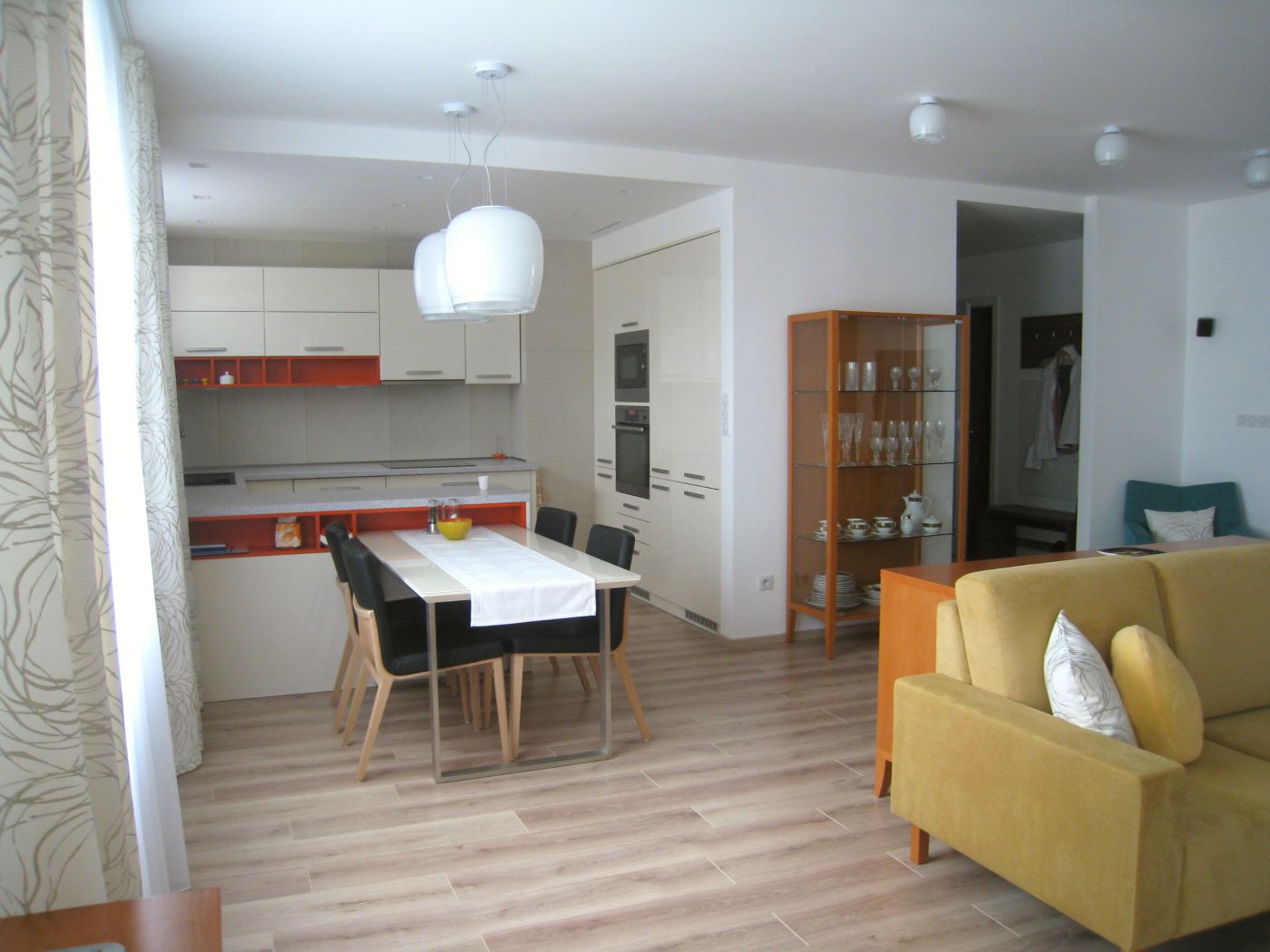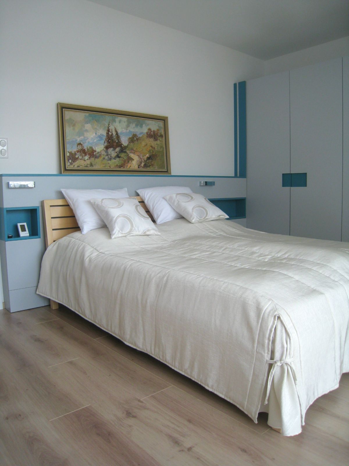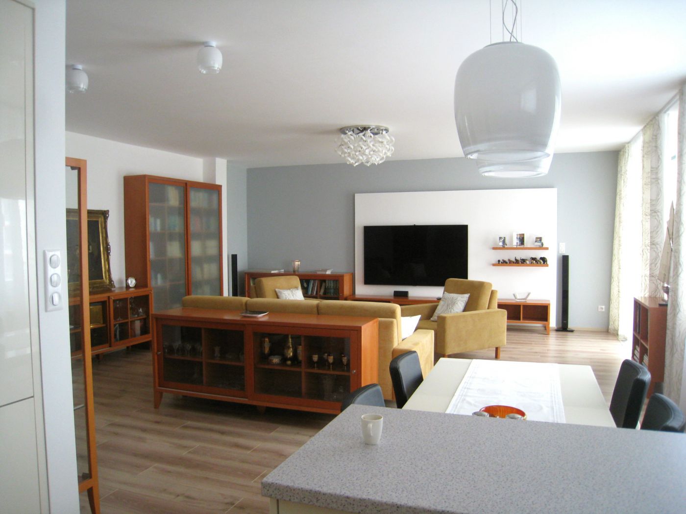 Do obývacej izby nadštandardného dvojizbového bytu chceli majitelia umiestniť jestvujúci kvalitný nábytok z ich predchádzajúceho bytu. Jestvujúca kuchynská linka bola nahradená novou, svetlou linkou, ktorá priestoru dodáva nový nádych a je prispôsobená požiadavkám domácej pani. Na linke nadväzuje jedálenský stôl s výraznými svietidlami, ktoré podčiarkujú dôležitosť tejto časti celého prepojeného priestoru. Rozmery spálne nedovoľovali praktické umiestnenie nočných stolíkov a tak ich funkciu prevzala predstavaná stienka so zabudovaným LED osvetlením, policami a skrinkami.