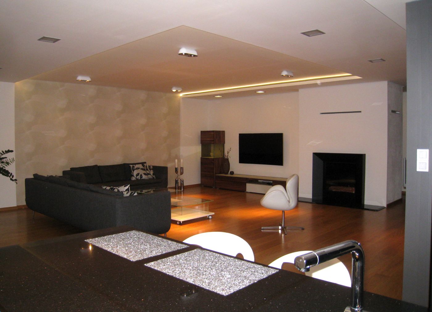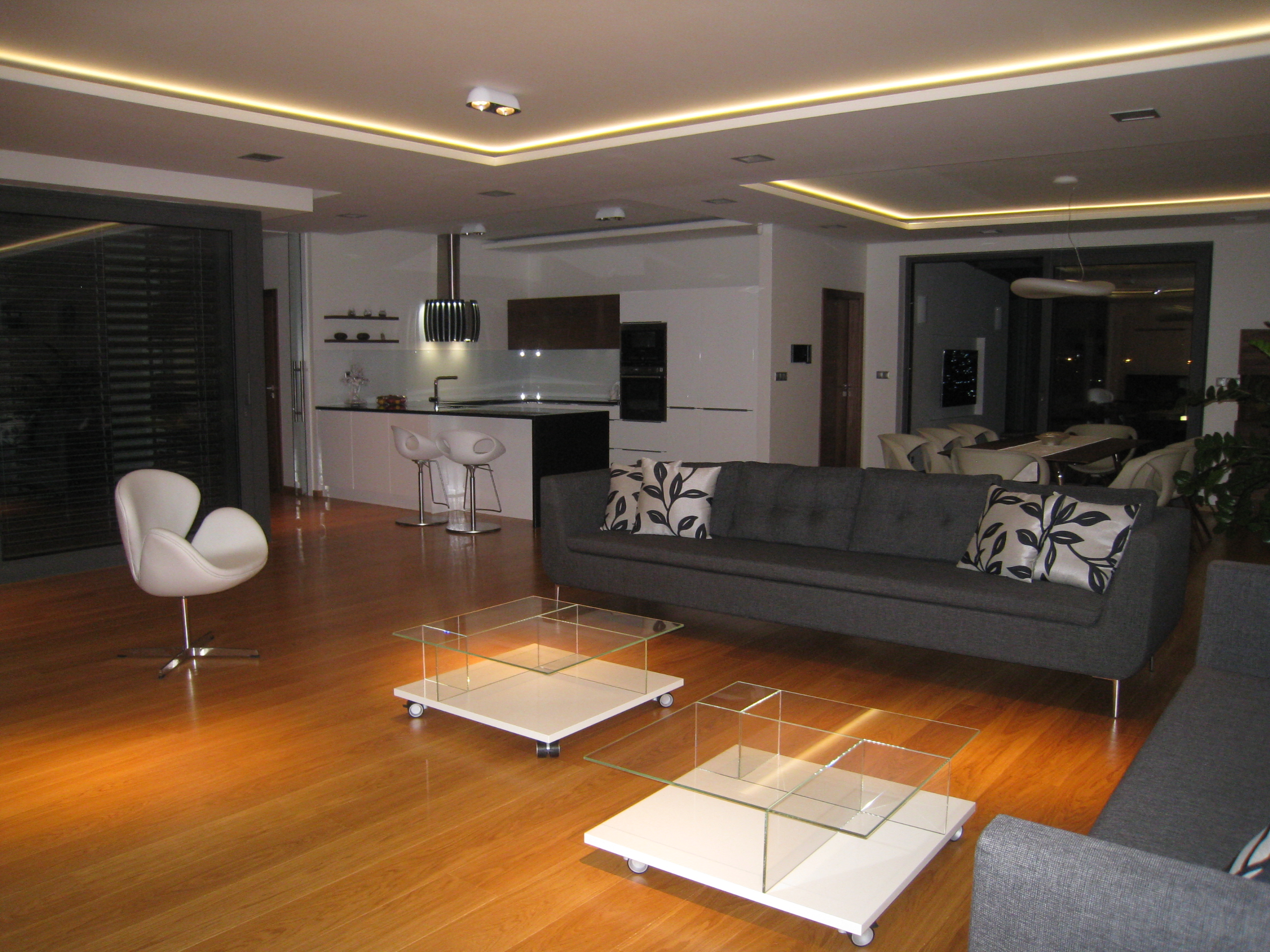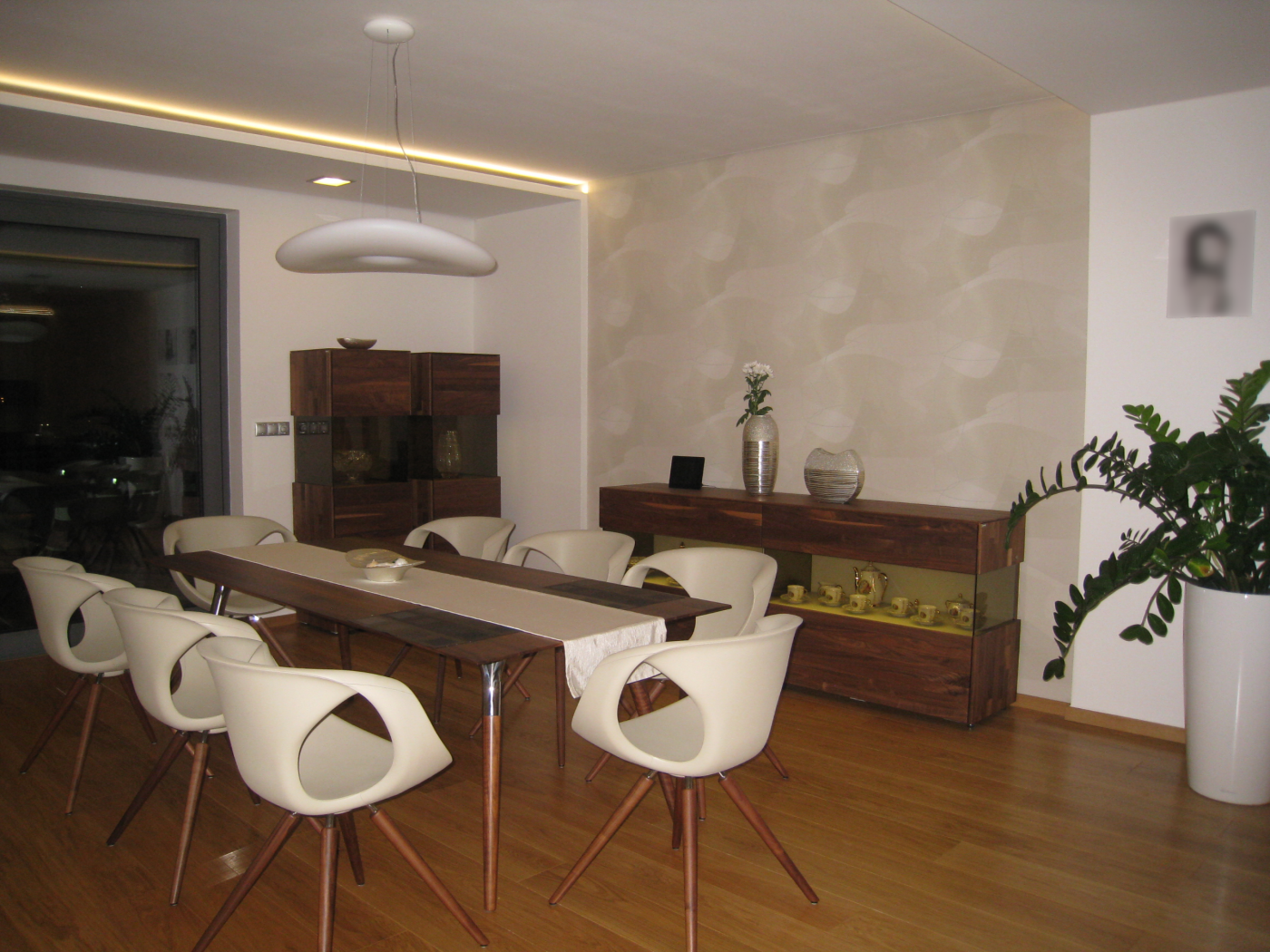 Návrh interiéru rieši bývanie pre rodinu s dvoma dospelými deťmi. Rozľahlý obytný priestor je rozdelený na zónu obývacej izby, jedálne a kuchyne, čo je zdôraznené aj podhľadmi a ich podsvietením. Priestor vďaka dubovej podlahe, dizajnovému nábytku a kuchyni vo vysokom lesku pôsobí vzdušne a luxusne. Ostatné sú zariadené v svetlých jemných farbách s výraznými farebnými doplnkami.