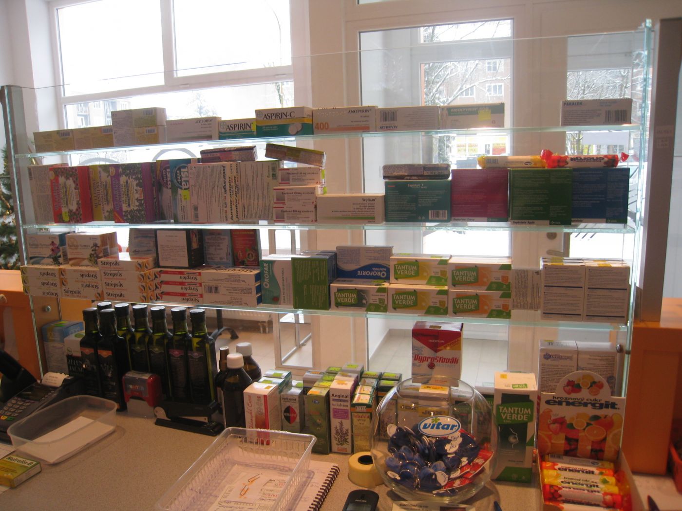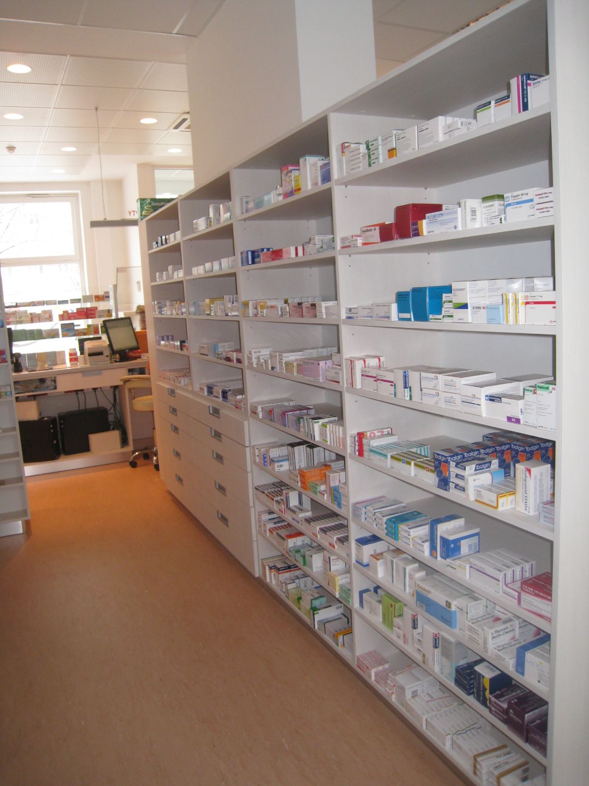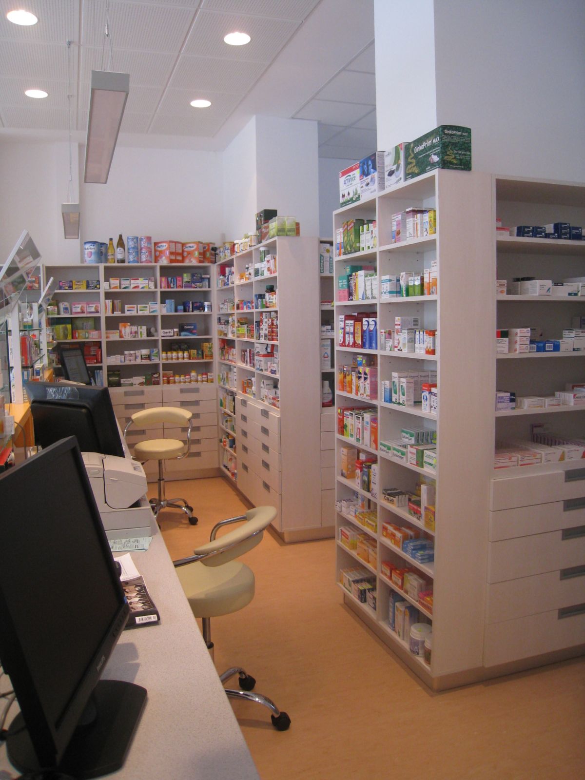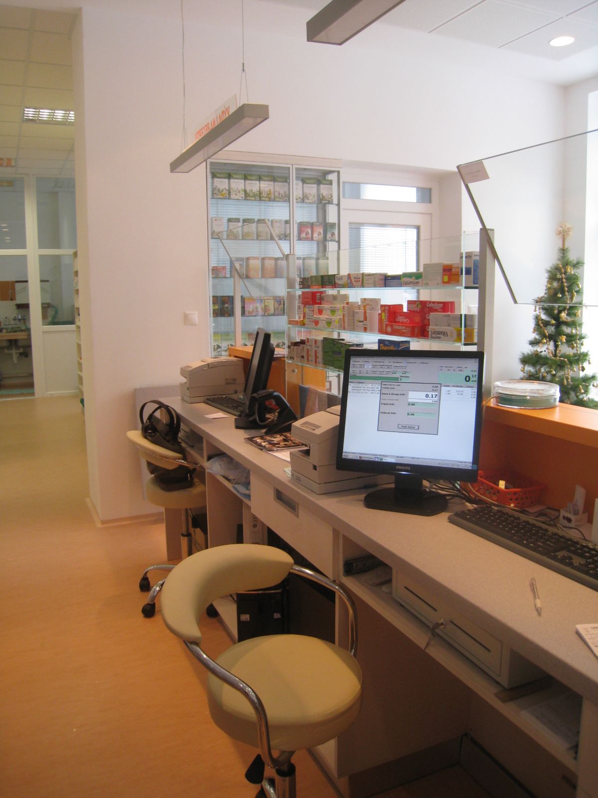 Prevádzka lekárne je vložená do priestorov staršieho objektu s parterom určeným na komerčné využitie a na zvyšných poschodiach sa nachádzajú bytové jednotky. Jestvujúce konštrukcie boli určujúce pre usporiadanie prevádzky a tiež priestorovo limitujúce. Usporiadanie výdajných okienok rešpektuje podlhovastý priestor oficíny. Čitateľnosť priestoru a prevádzky zdôrazňujú farby výrazné farby v kombinácii s tlmenými farbami úložného nábytku.