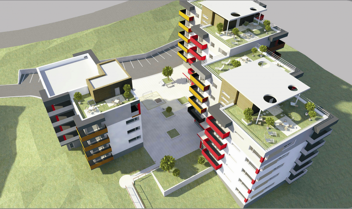 "Vidieť a byť videný " je stručná charakteristika návrhu obytného komplexu polyfunkčného charakteru vo svahu pod sídliskom v Považskej Bystrici. Areál komplexu tvoria dva 4-6 podlažné obytné bloky A a B osadené na pozemok do tvaru "V" tak, aby boli ideálne natočené vzhľadom na svetové strany a zároveň umožňovali výhľad na centrum mesta a okolitú prírodu. Priestor medzi blokmi vytvára uzavreté námestie poskytujúce nerušený oddych a priestor na stretávanie sa. Obytné bloky ponúkajú moderné nadštandardné bývanie vo veľkoplošných bytoch s priestrannými terasami. Ploché strechy bloku B poskytujú pre obyvateľov relaxačné priestory s výhľadmi na široké okolie